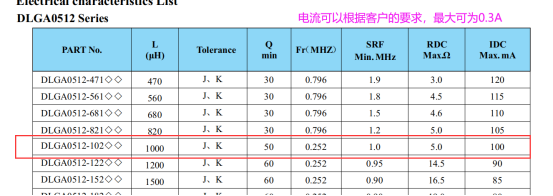 客戶原先使用的是B82144A2105J色環(huán)電感,這款電感對應谷景的DLGA0512-102JTB,在參數上,TDK的電流只能做到0.2A,谷景的可以做到0.3A。